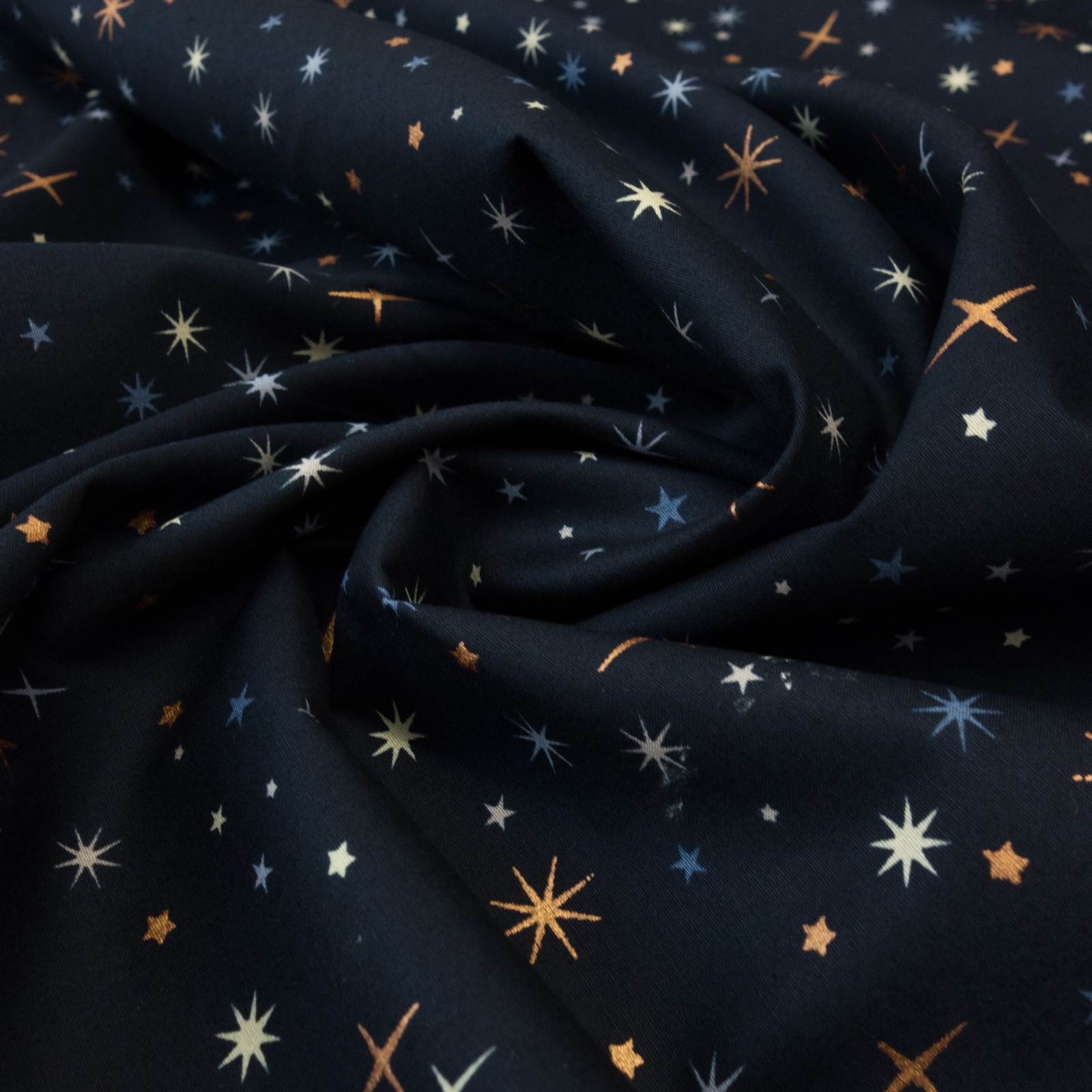 Feines Baumwollgewebe bedruckt mit teilweise gold schimmernden Sternen. Geeignet z.B. für Wohnaccessoires, Dekoration und wiederverwendbare Geschenkverpackungen.