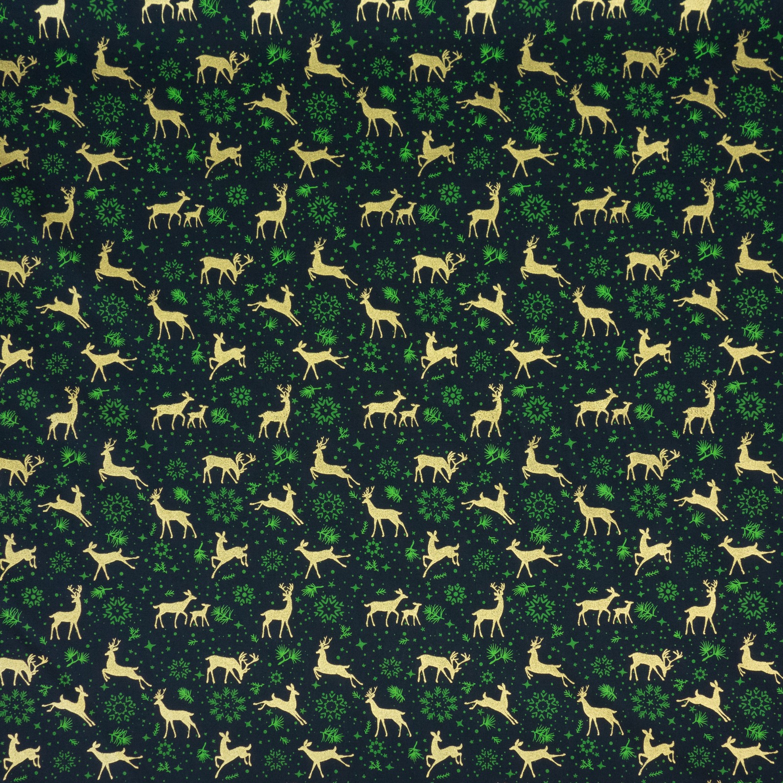 Feines Baumwollgewebe bedruckt mit gold schimmernden Silhouetten von Hirsch. Geeignet z.B. für Wohnaccessoires, Dekoration und wiederverwendbare Geschenkverpackungen.