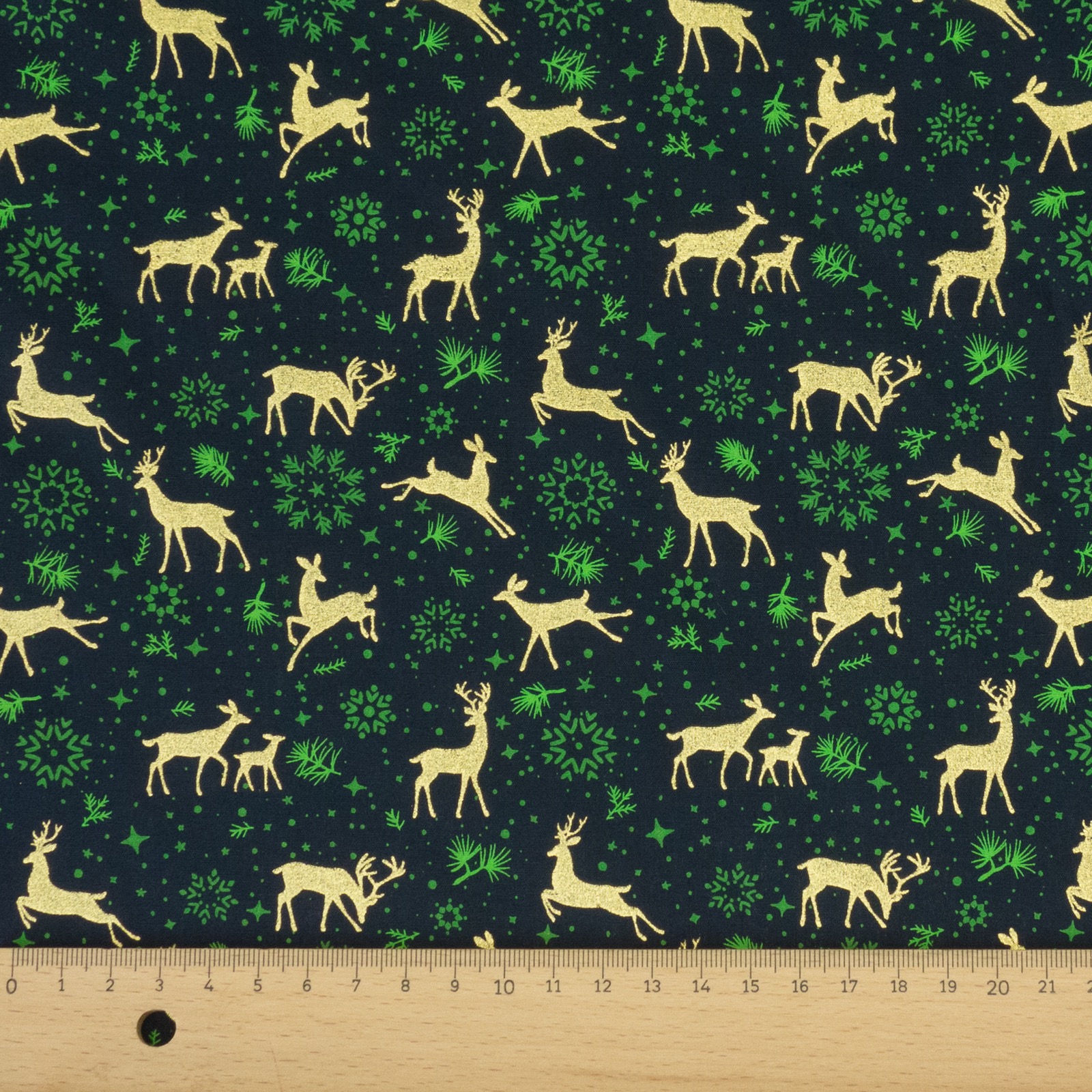 Baumwollstoff, Popeline, dunkelblau, grün, gold, Glanzeffekt, Weihnachtsmotive