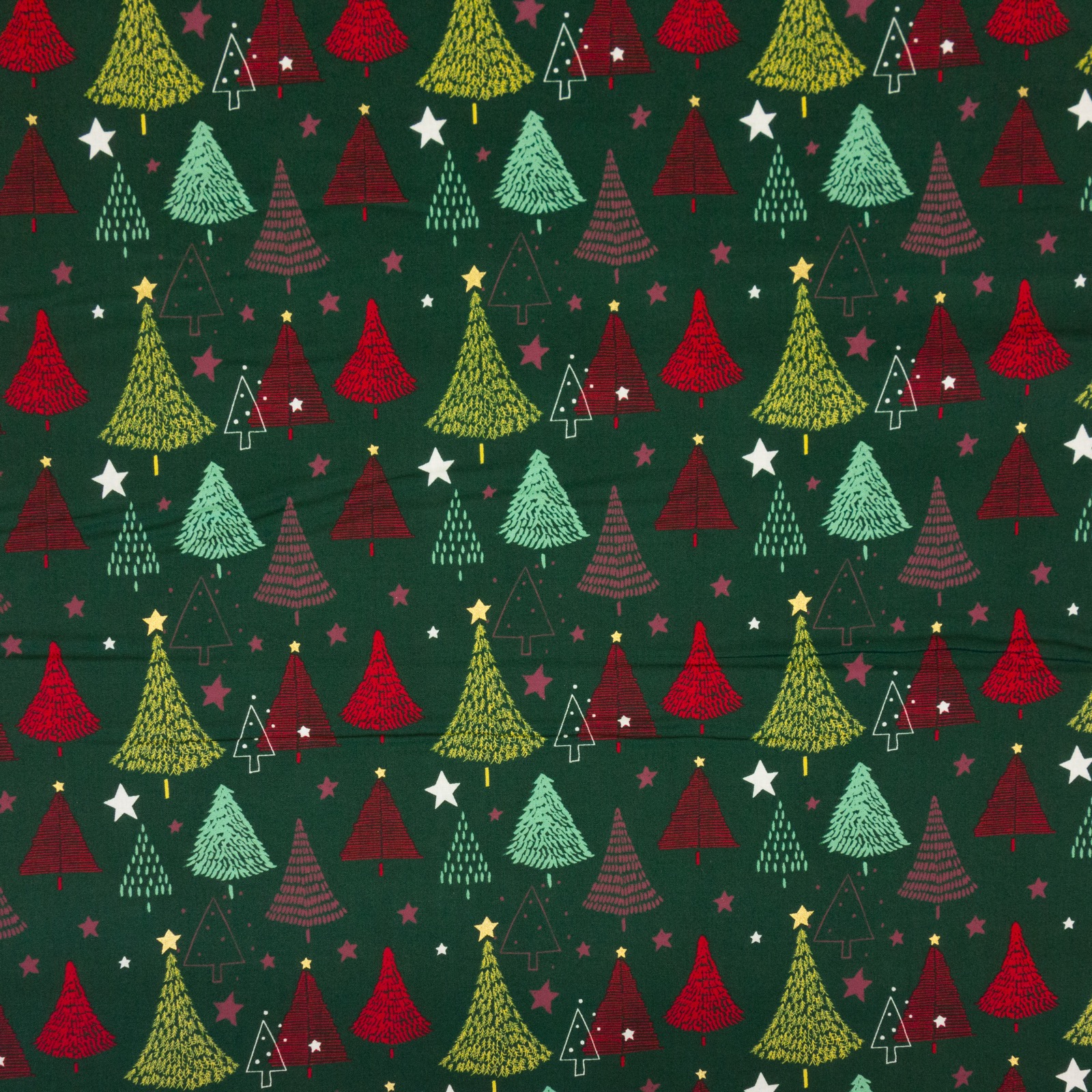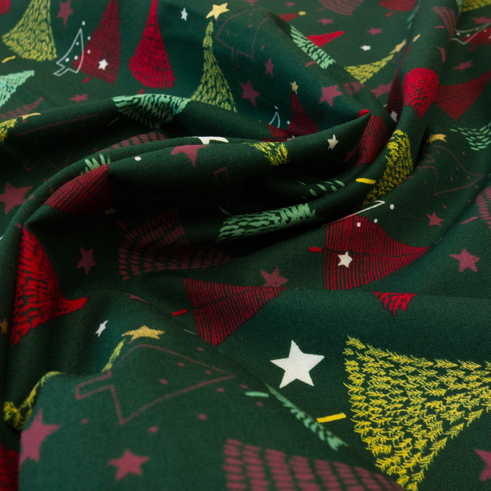 Feines Baumwollgewebe bedruckt mit verschiedenen Nadelbaummotiven. Geeignet z.B. für Wohnaccessoires, Dekoration und wiederverwendbare Geschenkverpackungen.