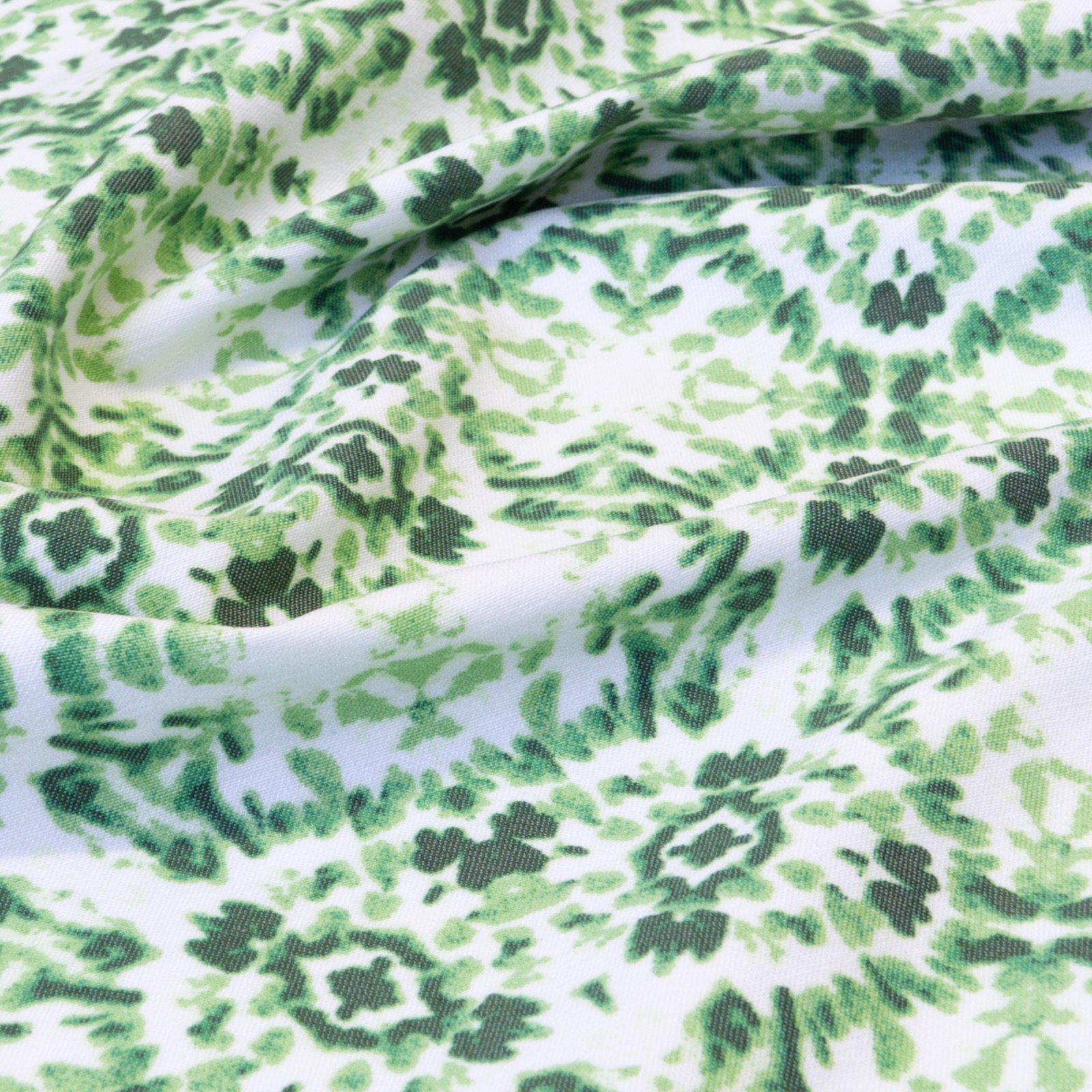 Dicht gewebtes und längselastisches Gewebe aus Viskose bedruckt mit einem grafischen Muster in Grüntönen. Geeignet z.B. für sommerliche Hosen.
