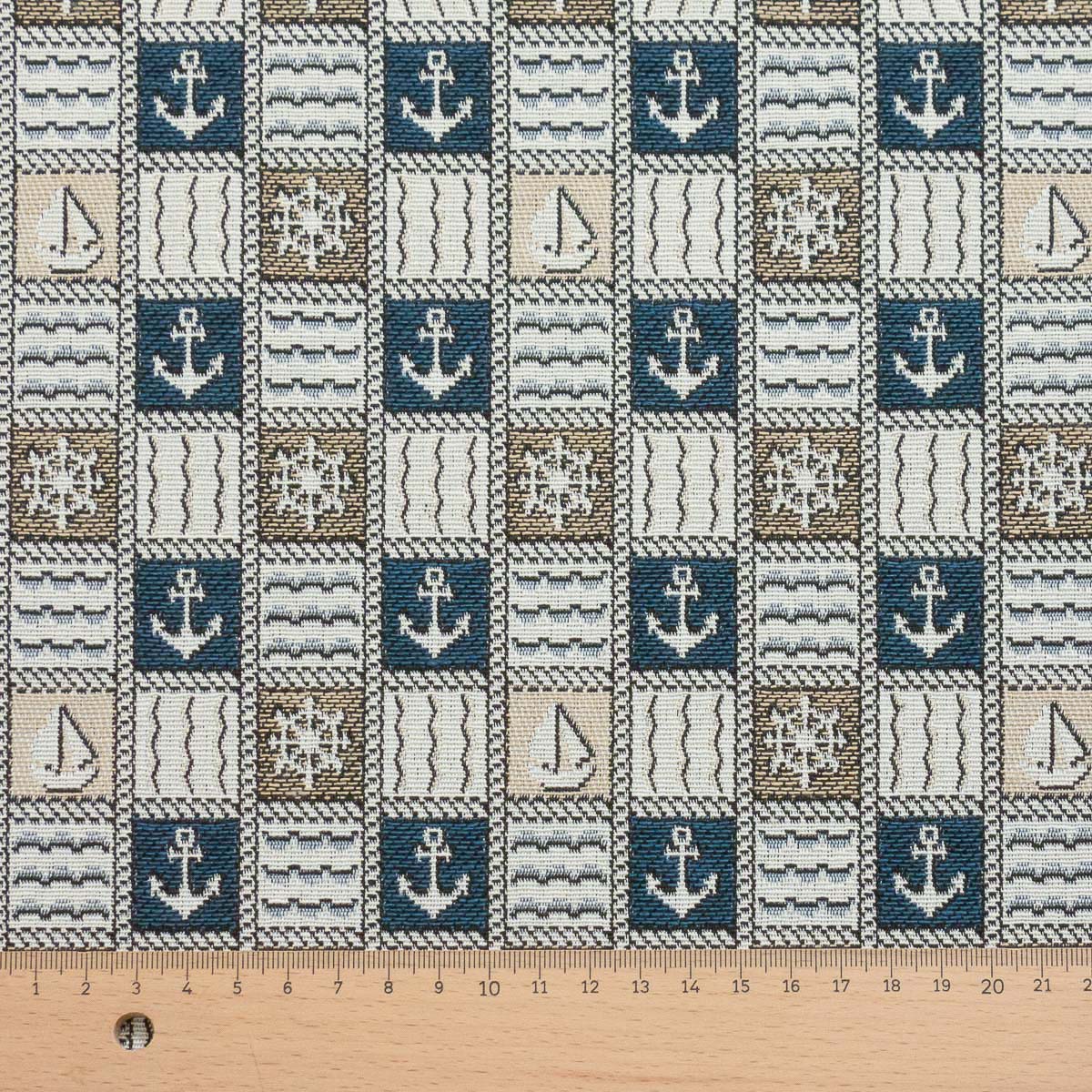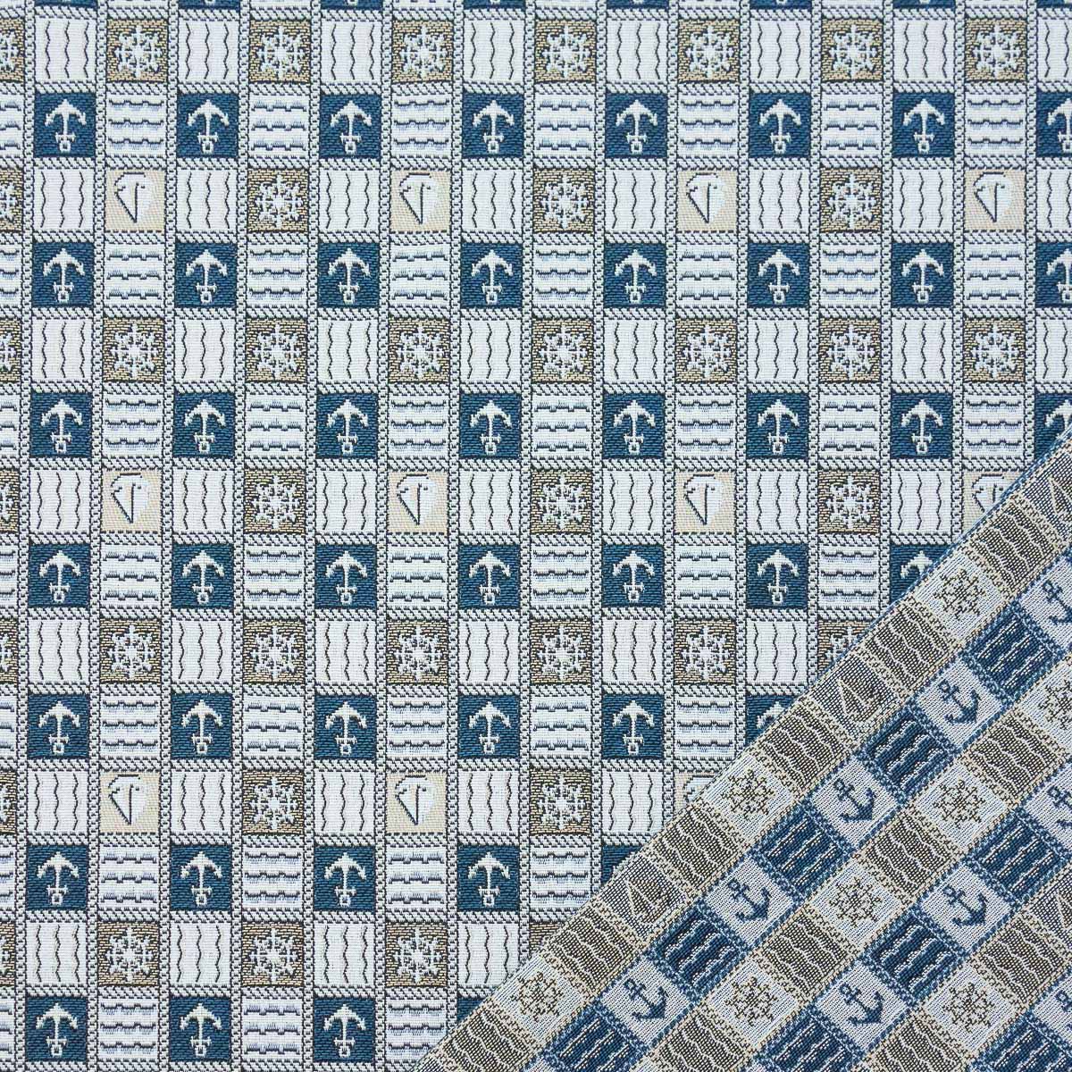 Robuster Gobelin mit eingewebten maritimen Motiven wie Anker und Steuerrad. Geeignet z.B. für leichte Polsterarbeiten, Wohnaccessoires und Taschen.