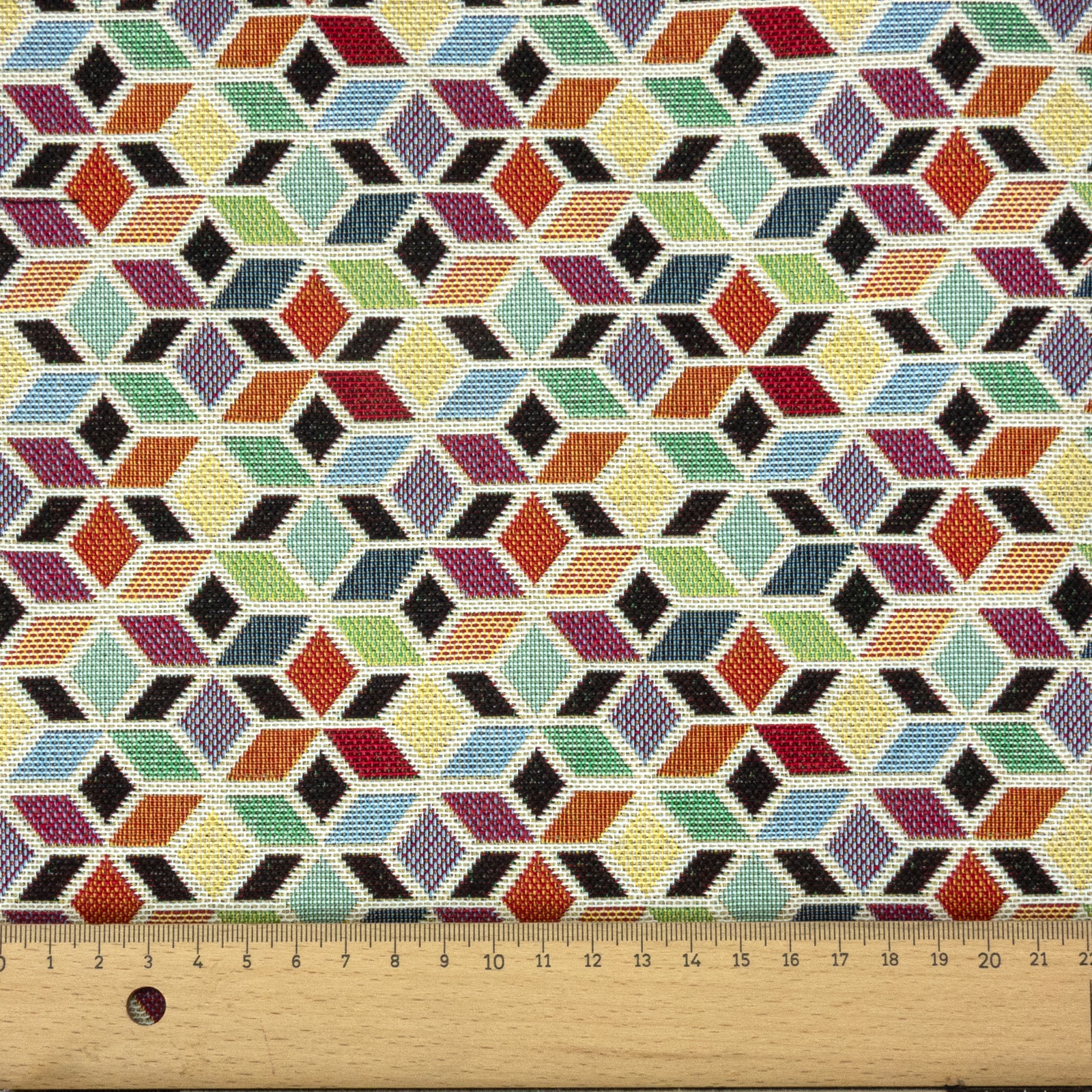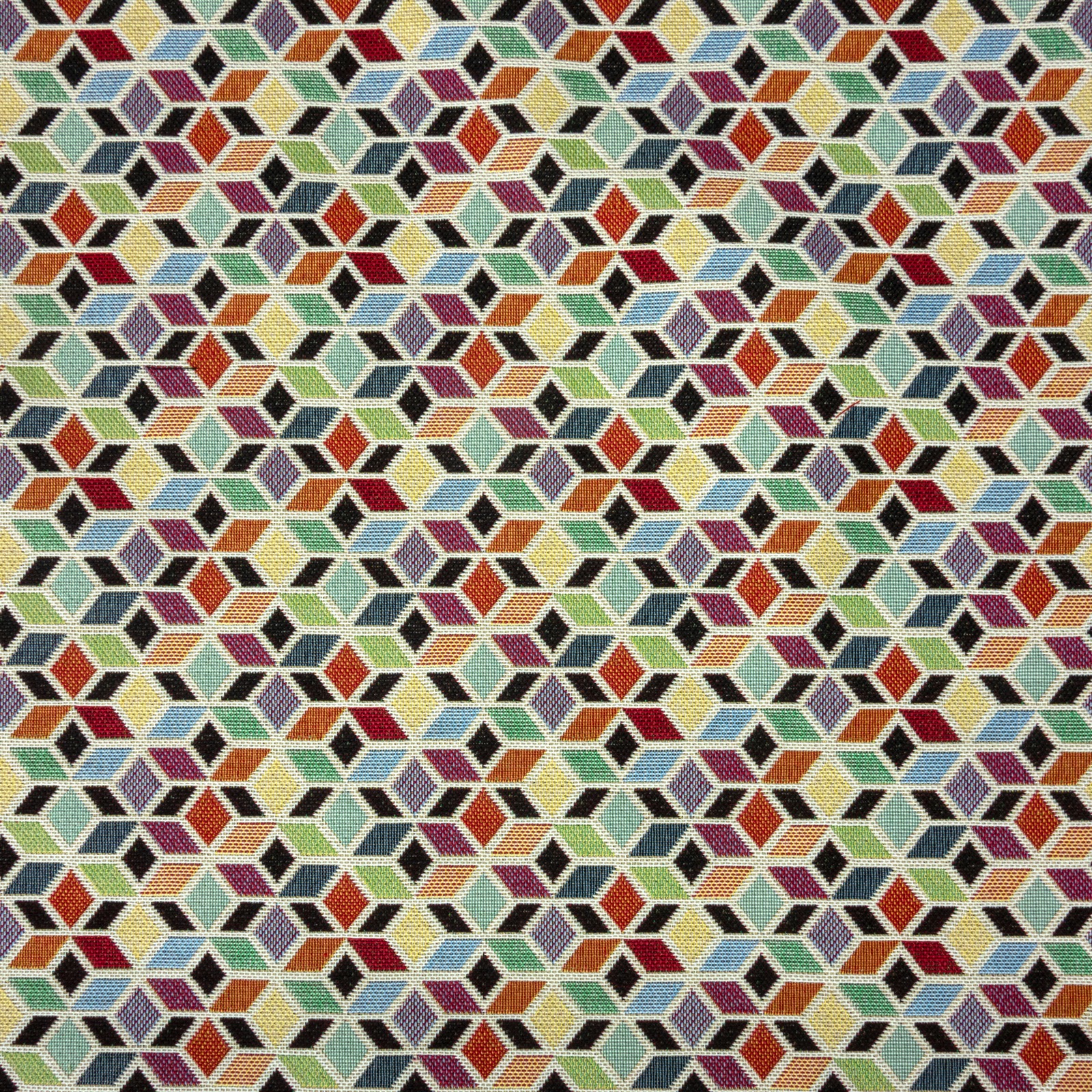 Robuster Gobelin mit eingewebtem, geometrischem Rauten-Muster. Geeignet z.B. für leichte Polsterarbeiten, Wohnaccessoires und Taschen.