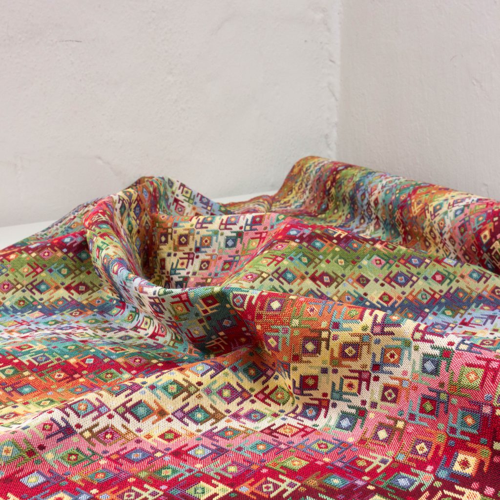 Dekostoff, Gobelin, rot, orange, blau, grüntöne, Ethno-Muster
