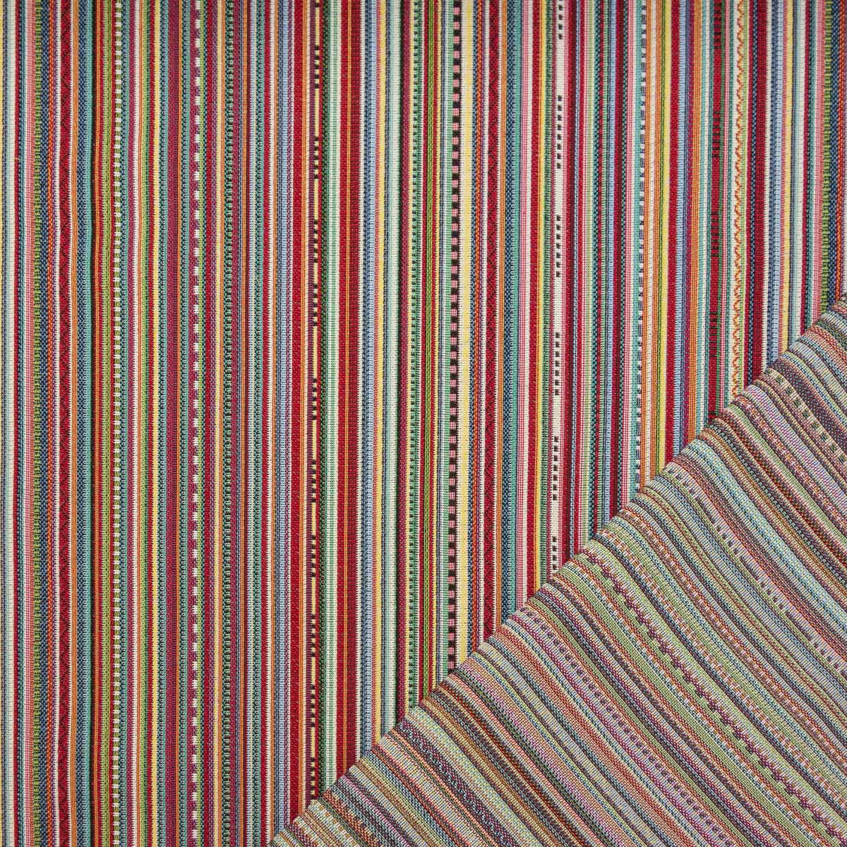 Robuster Gobelin mit eingewebtem, geometrischem Streifen-Muster. Geeignet z.B. für leichte Polsterarbeiten, Wohnaccessoires und Taschen.