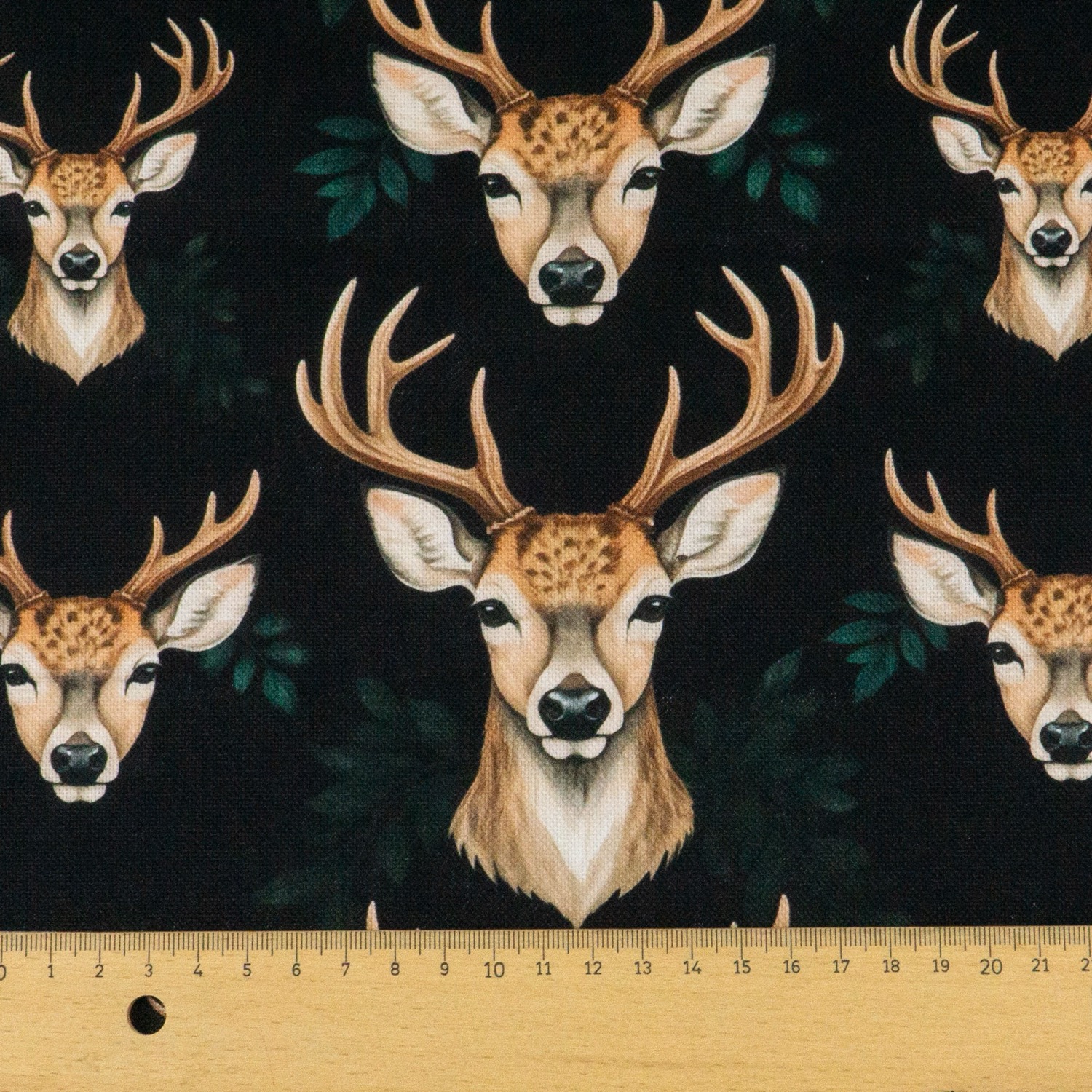Leichter Dekostoff mit grafisch angeordneten Hirsch Portraits. Geeignet z.B. für Dekokissen, leichte Vorhänge und Beutel.