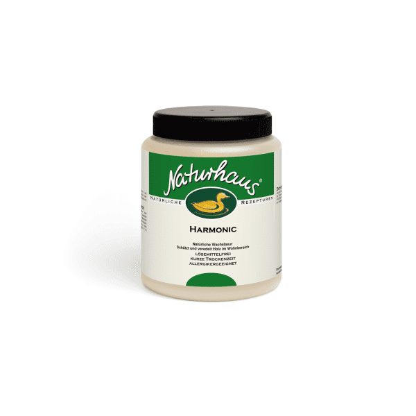 NATURHAUS Harmonic besteht zu 100% aus natürlichen Bienen- und Pflanzenwachsen, Schellack sowie Wasser. Es eignet sich für leicht bis normal beanspruchte Holzflächen im Innenbereich z. B. Wand- und Deckenverkleidungen.