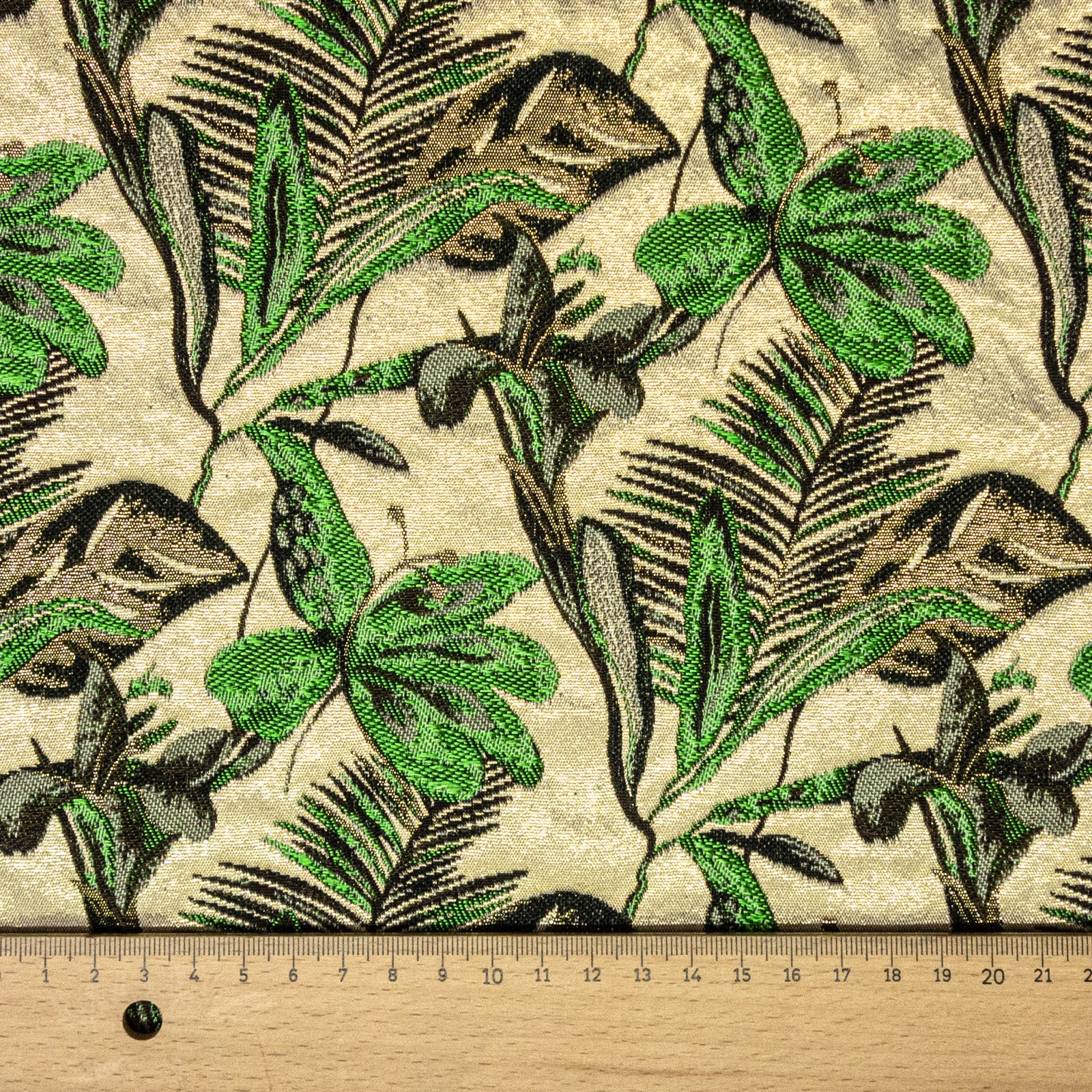 Jacquardgewebe aus schimmernden Effektgarnen, mit eingewebten, tropischen Blättern und goldenen Glanzfäden. Geeignet z.B. für Blousons und Wohnaccessoires.