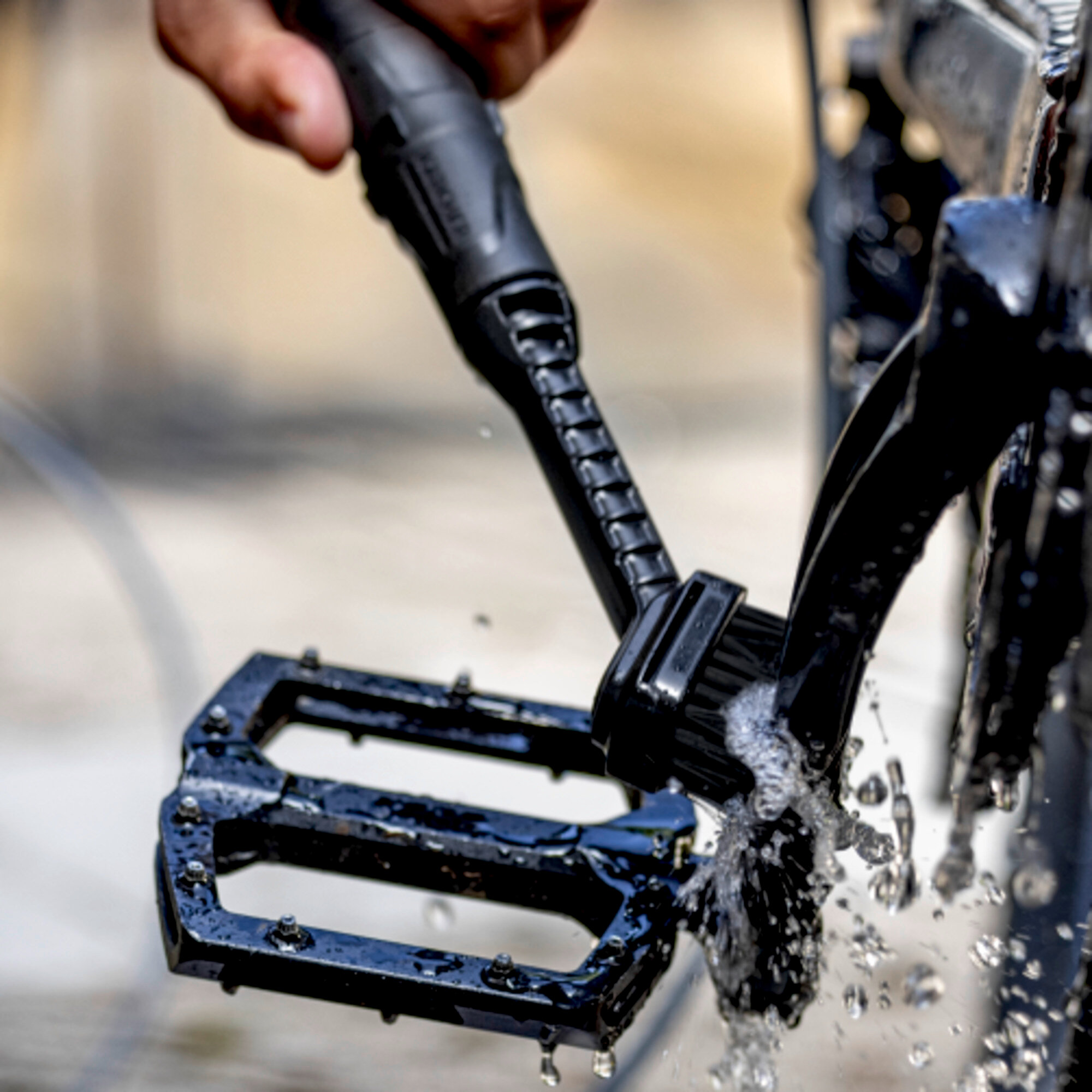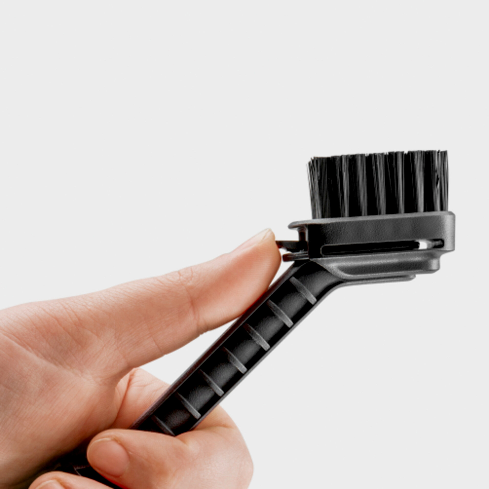 Die Detailbürste kombiniert den Effekt aus einem flach aufgefächerten Wasserstrahl und der mechanischen Reinigungswirkung der Borsten für eine gründliche Reinigung von schwer erreichbaren und verwinkelten Stellen, zum Beispiel am Fahrrad. Der Schmutz wird gelöst und direkt weggeschwemmt. Da Wasser nur dann zum Einsatz kommt, wenn der Abzug am Gerät betätigt wird, kann der Wasserverbrauch sehr effizient und individuell gesteuert werden. Auf diese Weise wird zugleich der Akku geschont. Die Montage der Bürste erfolgt direkt an der Pistole. Der Bürstenkopf kann bei Bedarf ausgetauscht werden. Die Detailbürste ist mit allen Mobile Outdoor Cleanern OC 3 kompatibel.