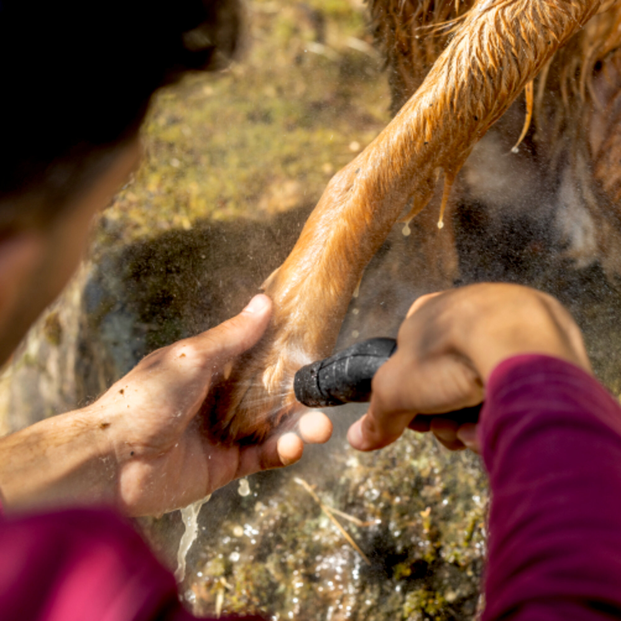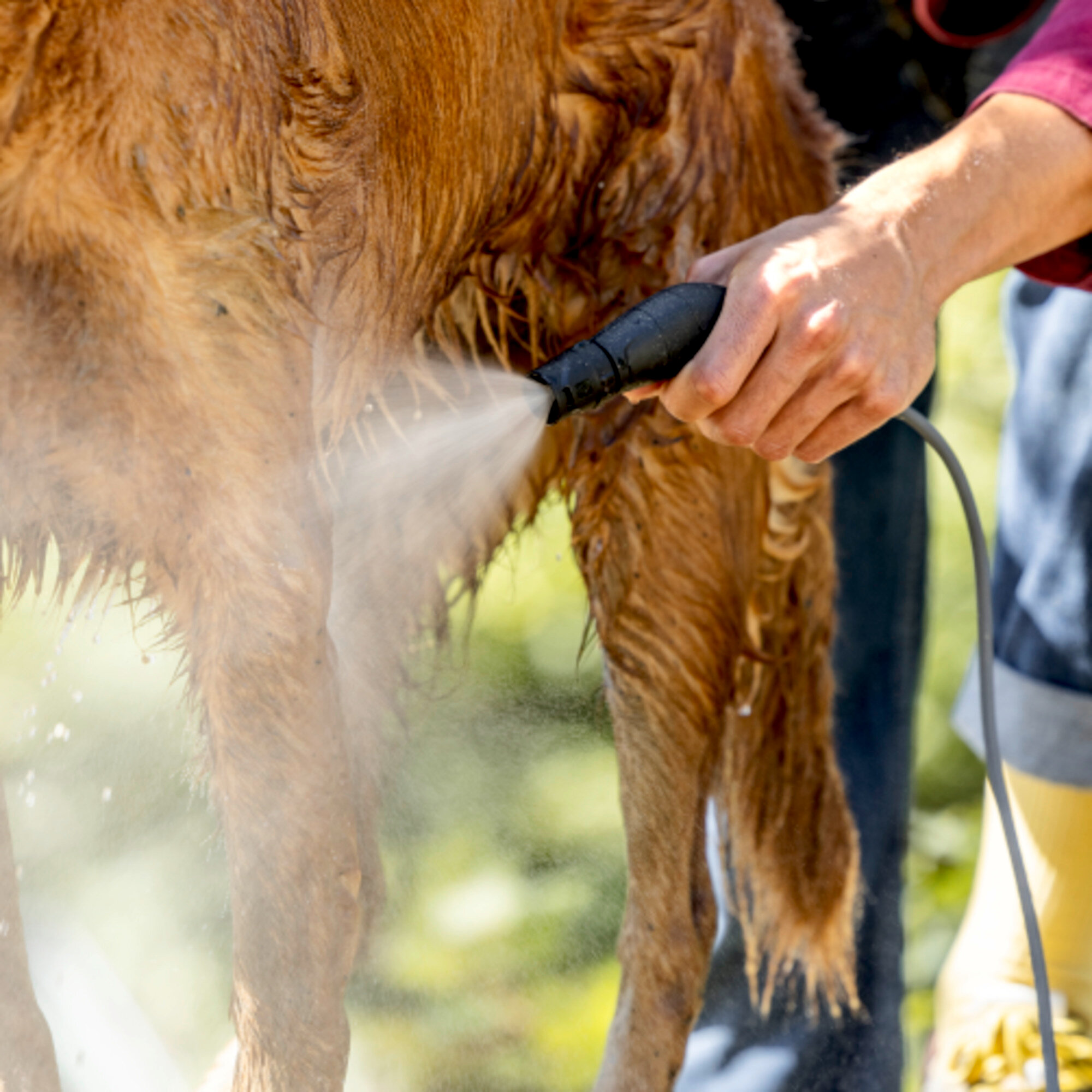Die Kegelstrahldüse eignet sich mit ihrem besonders weichen und angenehmen Duschstrahl besonders für die Reinigung von Haustieren wie Hunden oder auch nur für deren Pfoten. Ideal nach Spaziergängen, bevor der Hund wieder ins Auto, ins Haus oder in die Wohnung darf. Die Düse erzeugt einen Strahl im Niederdruckbereich (vergleichbar mit einem Strahl aus dem Hauswasserhahn) und ist deshalb absolut unbedenklich für die Anwendung an Tieren.