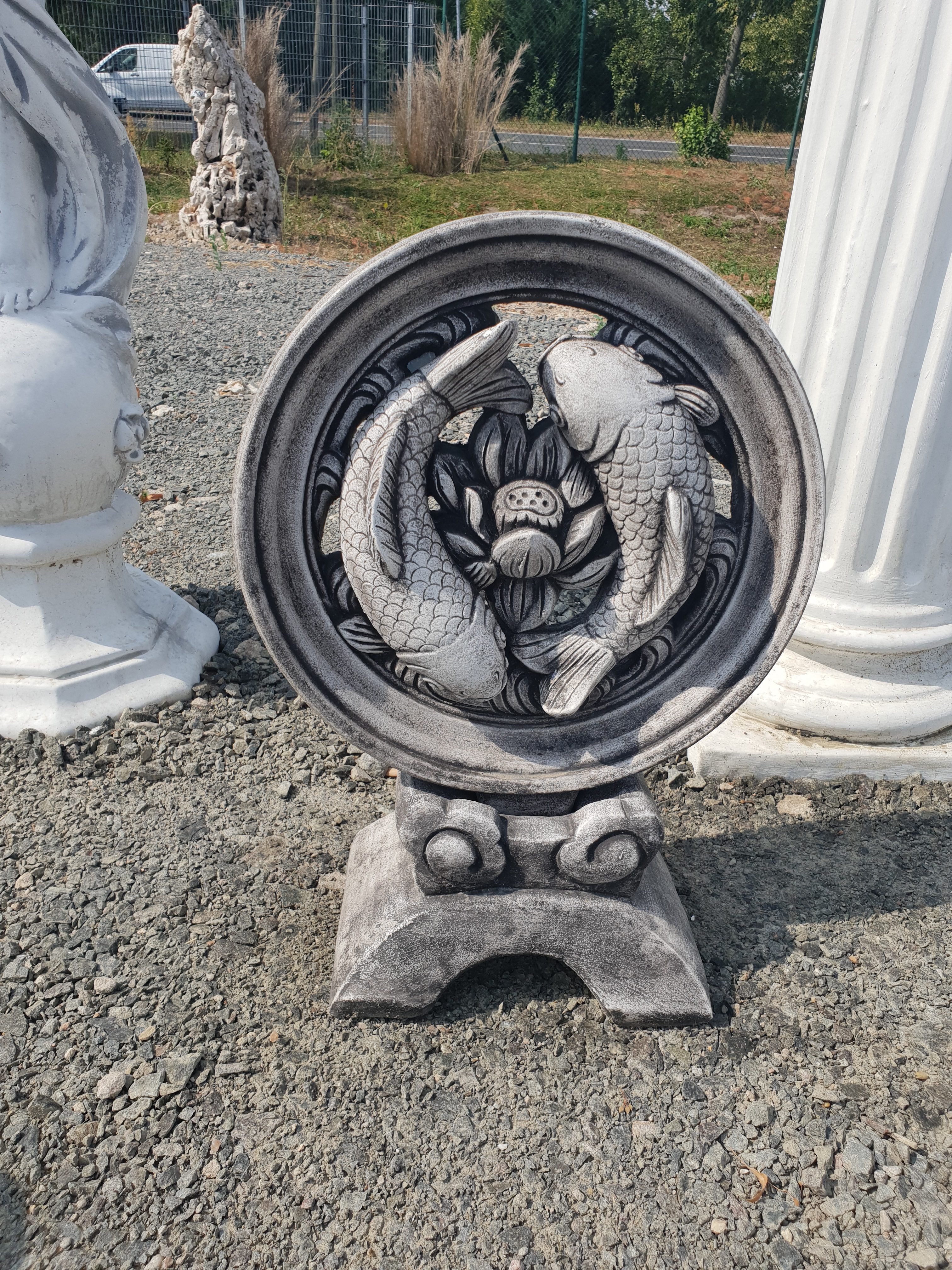 Die Gartenfigur ist ca. 53cm hoch und wiegt etwa 18kg. Die Stellfläche der Figur beträgt ca. 19cm x 27cm. Die Betonfigur besteht aus zwei Teilen – zum einem aus der Koi Scheibe und zum anderen aus dem Fuß.
