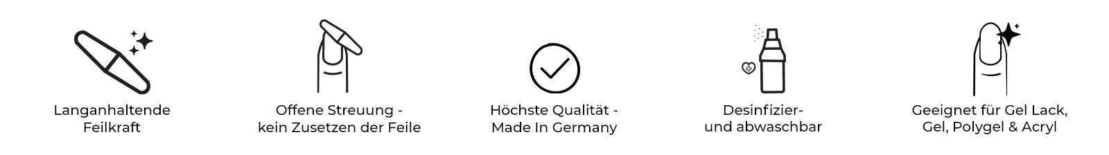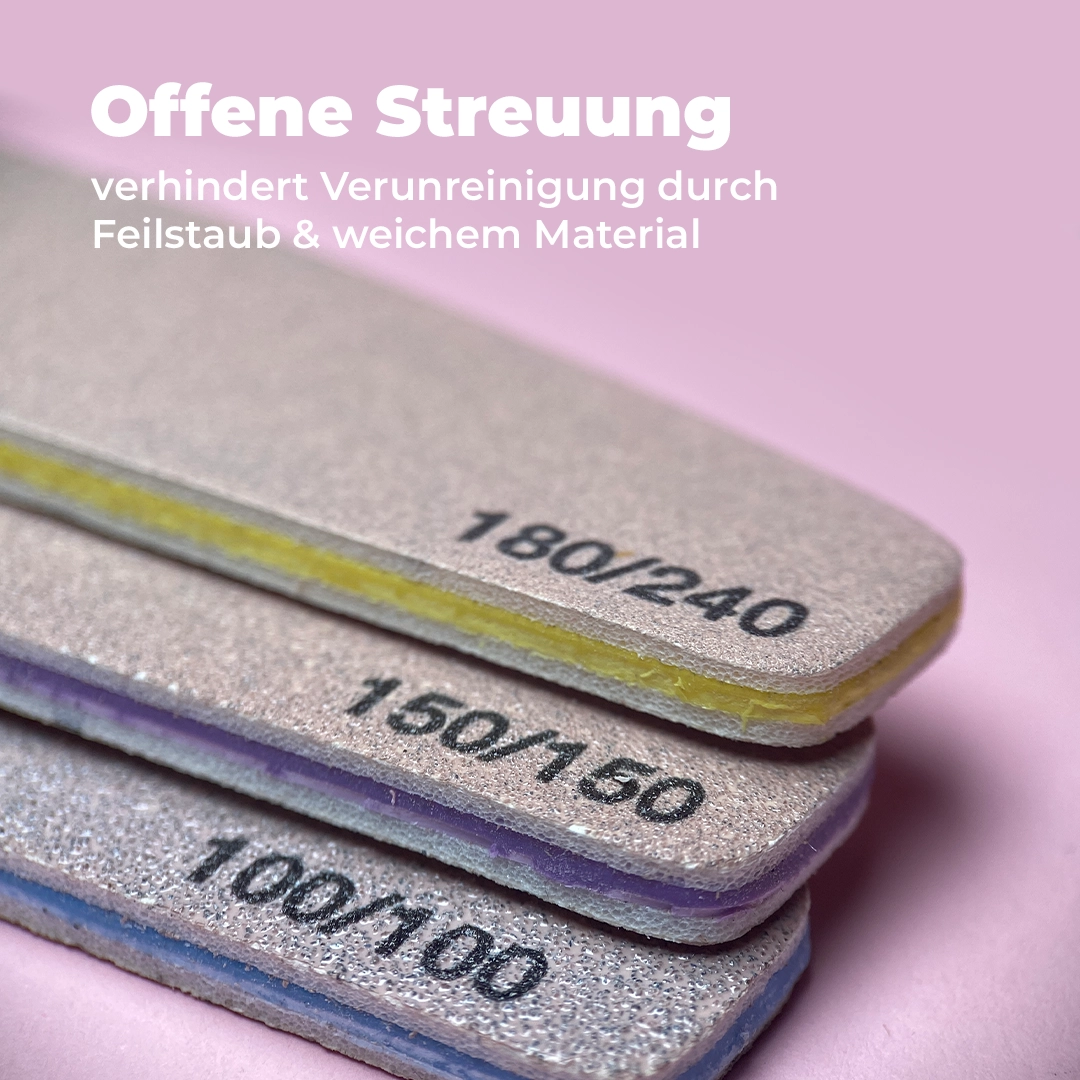 Die Longlife Feile überzeugt durch ihre speziell entwickelte Longlife-Beschichtung, die die Anfangskraft der Feile besonders lange erhält. Dank der offenen Streuung des Korundes setzt sich die Feilfläche kaum zu, was insbesondere bei weichen Gelen einen großen Vorteil bietet und die Feilkraft deutlich erhöht.