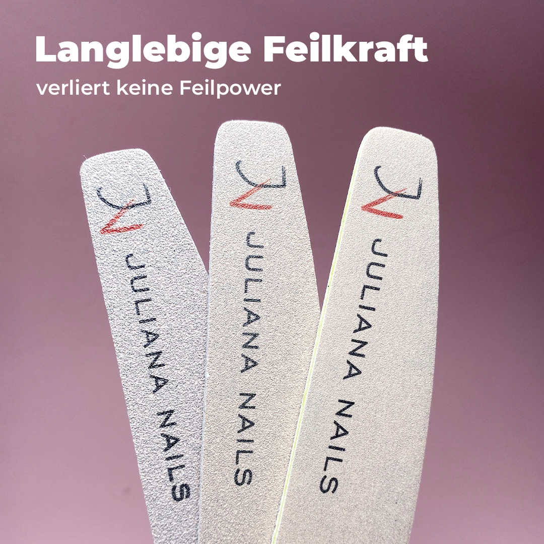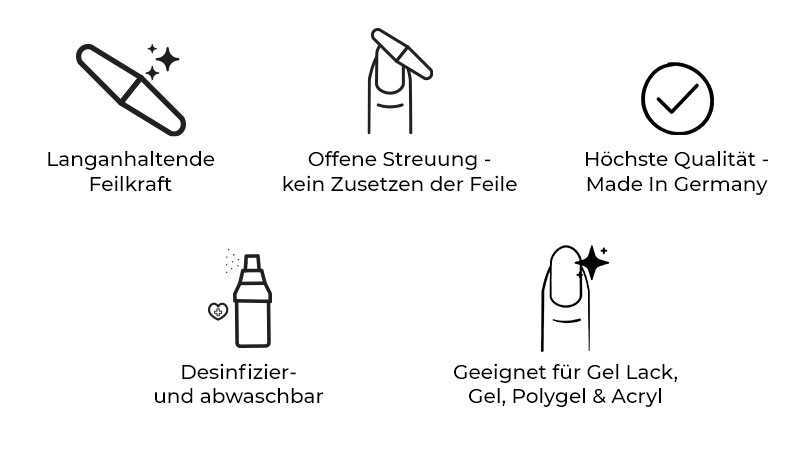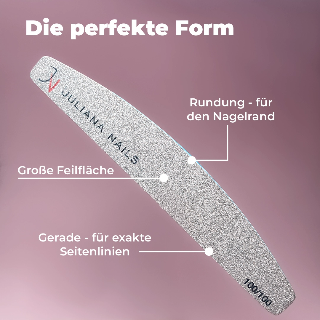 Die Feile eignet sich perfekt zum Kürzen, Abtragen und Formen von Gel, Gel Lack, Polygel, Acryl Modellagen und Tips.