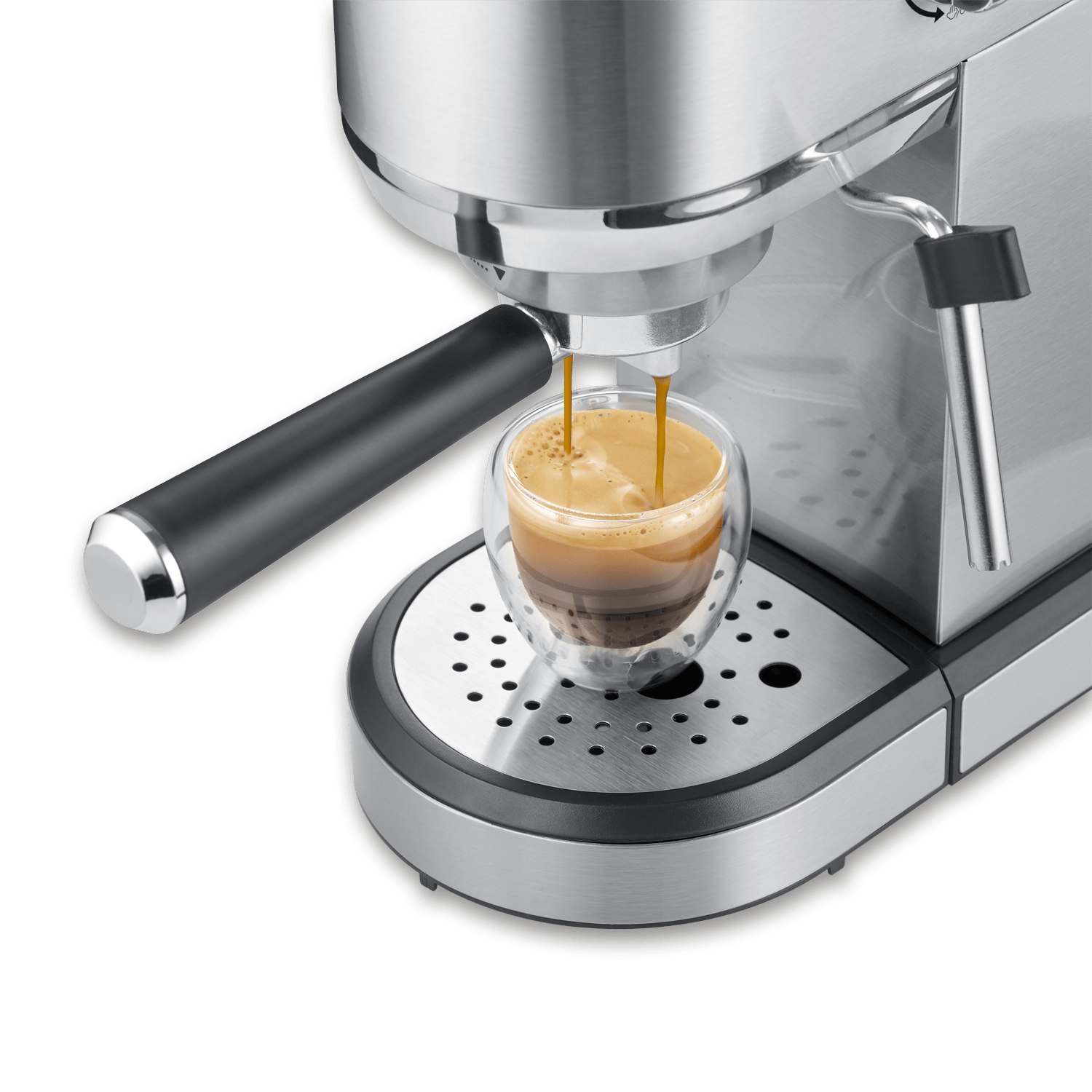 La cafetera espresso con portafiltro Severin KA 5997 Newspresa es la elección ideal para los amantes del café que valoran la calidad, la funcionalidad y un diseño compacto.Con su portafiltro de acero inoxidable de alta calidad y la potente bomba italiana ULKA, que genera hasta 20 bares de presión, se consigue una crema perfecta y un desarrollo óptimo del sabor.El sistema de calentamiento thermoblock garantiza un calentamiento rápido para poder disfrutar del espresso en el menor tiempo posible, mientras que la boquilla espumadora de leche giratoria permite preparar una cremosa espuma de leche para cappuccino y latte macchiato y también se puede utilizar para agua caliente.