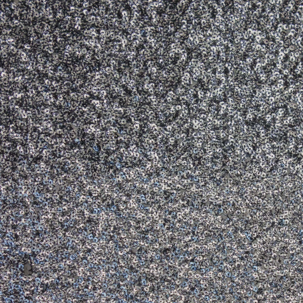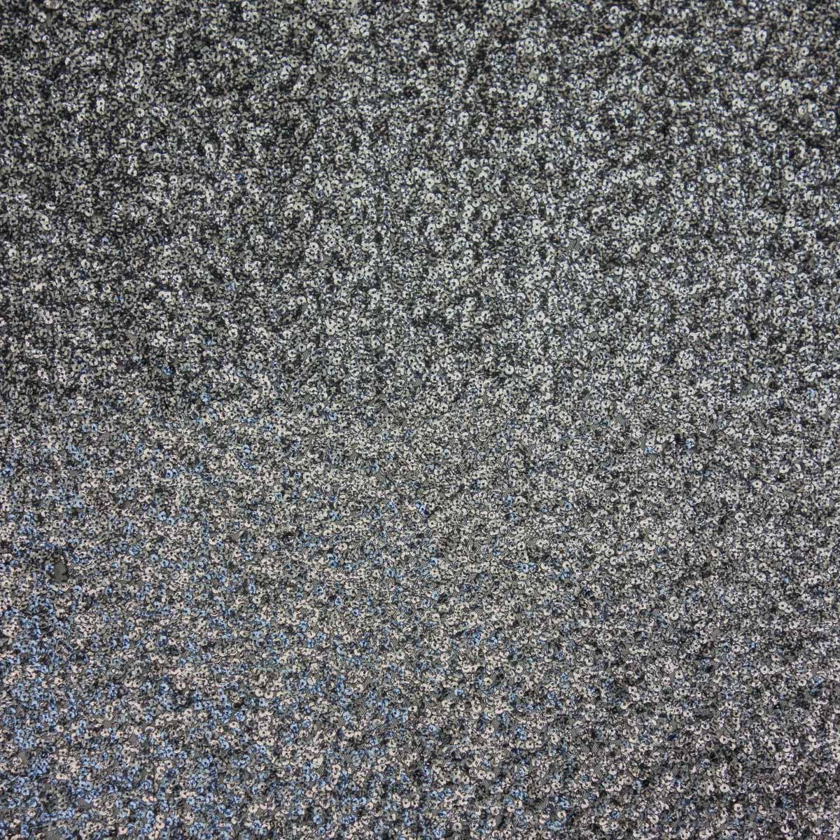Dicht an dicht applizierte, silber und nachtblau melierte Minipailletten mit seidenmattem Glanz auf einem feinen Tüllgewebe. Geeignet für festliche Abendmode.