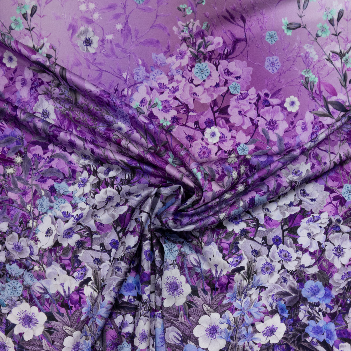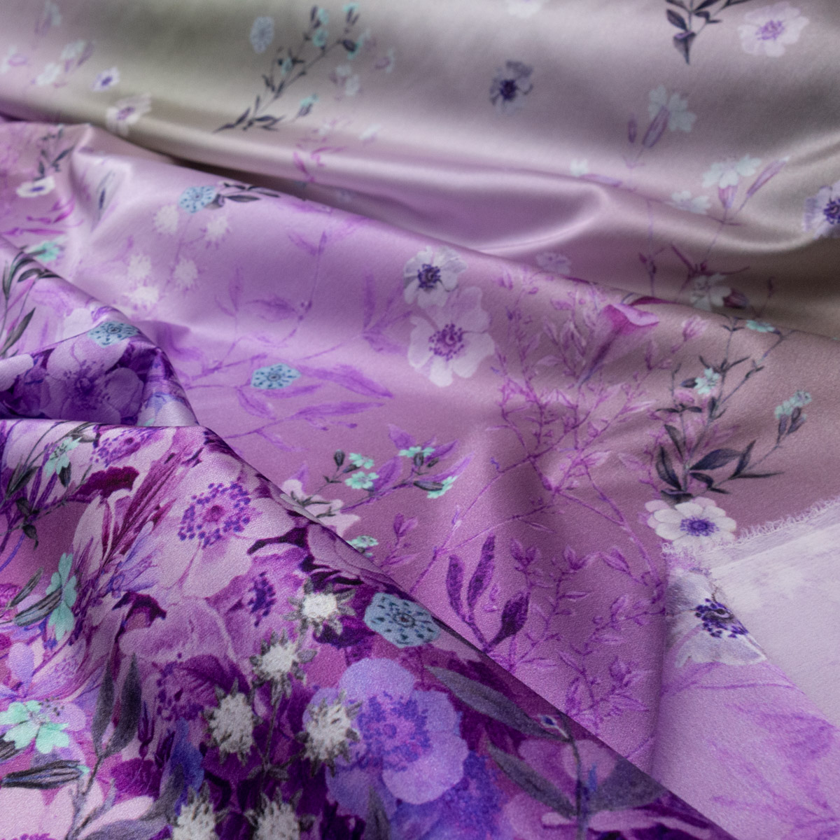 Leichtes und elastisches Gewebe aus Seide und Kunstfaser bedruckt mit einem 150 cm langen Muster aus detaillierten Blüten und einem Farbverlauf von Lila und Grün und einer glatten Satinabseite. Geeignet z.B. für fließende Blusen und Kleider.