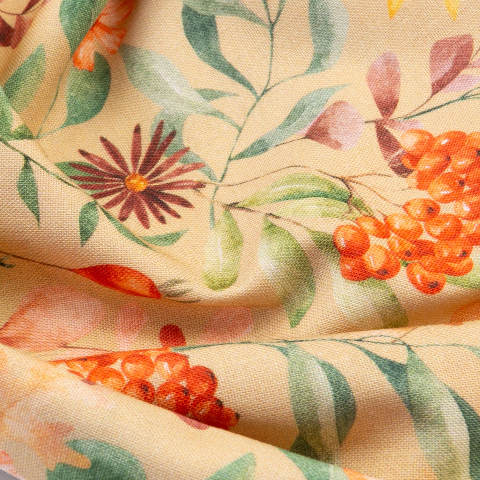 Leichtes Baumwollgewebe bedruckt mit floralen Motiven und Vogelbeeren. Geeignet z.B. für Hemden, Blusen, Kinderbettwäsche, Patchwork / Quilten, leichte Beutel sowie Geschenkverpackungen.